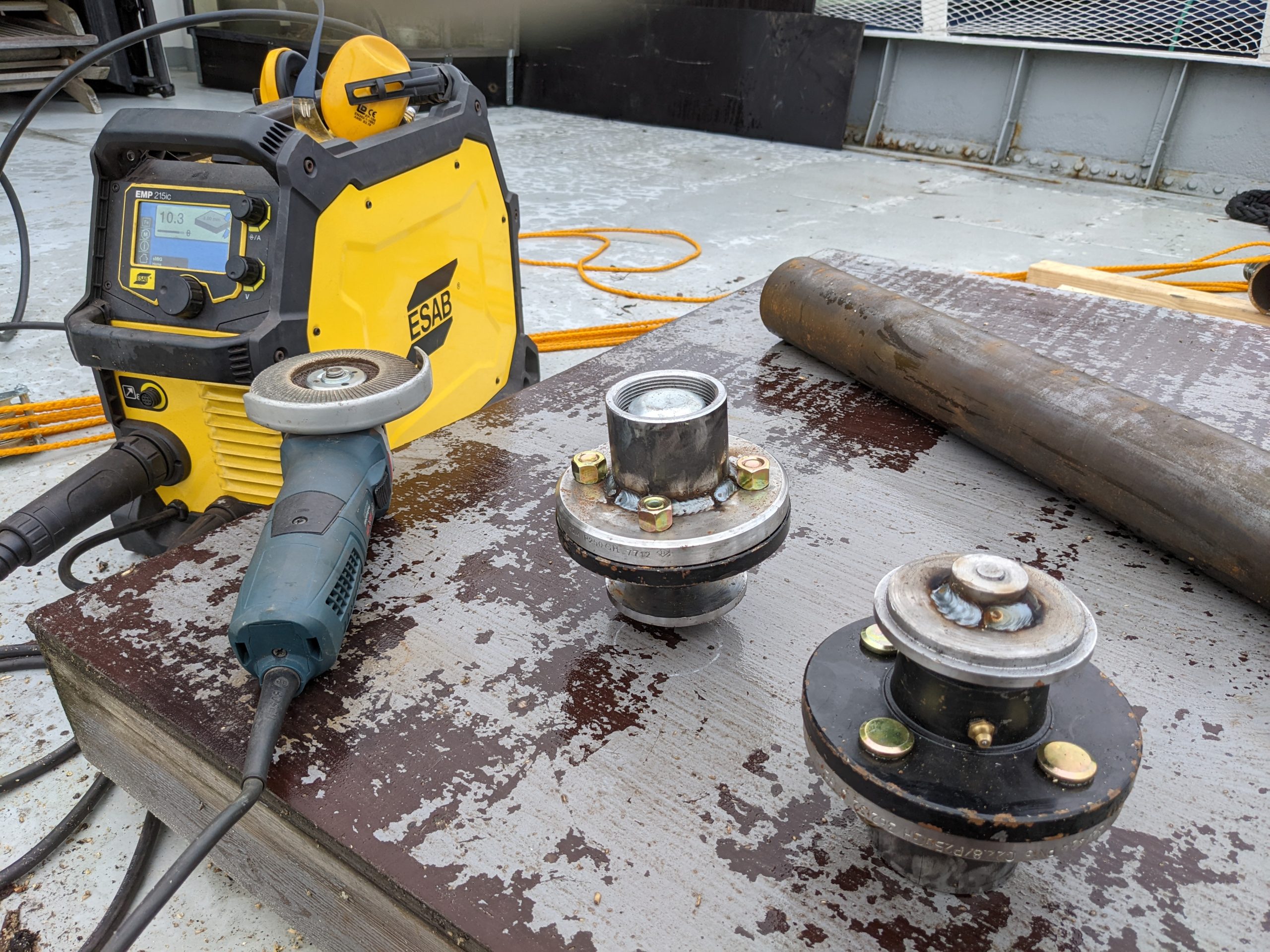 Här syns axeltapparna klara att svetsas mot reling och rör. Johan på Castor var vänlig nog att låna ut sin svets så jag slapp släpa Kemppin över alla trösklar. Tack!